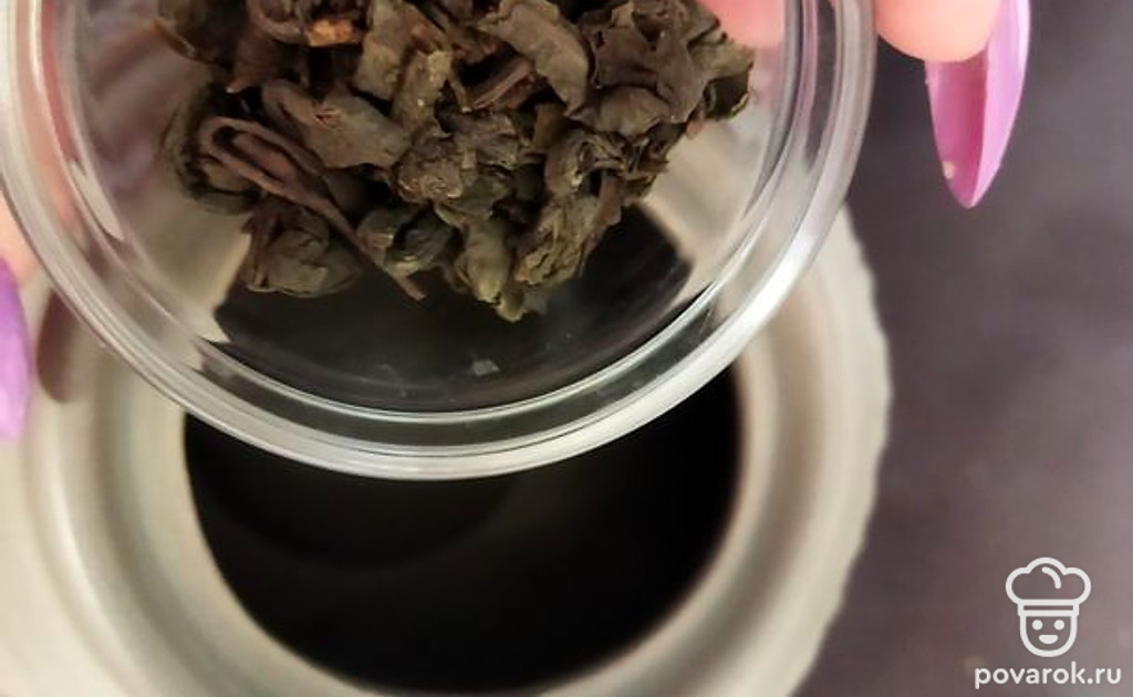 Заварочный чайник заранее ошпарьте, всыпьте зеленый чай.