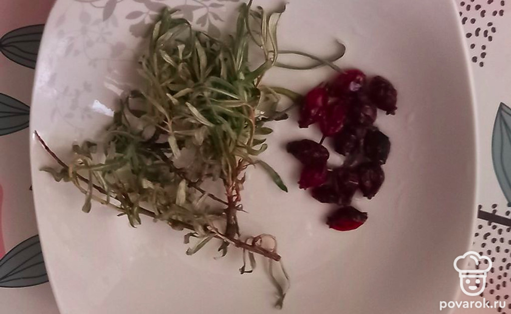 Помойте ветки и листья облепихи и ягоды шиповника. Шиповник можно взять свежий или сушеный.