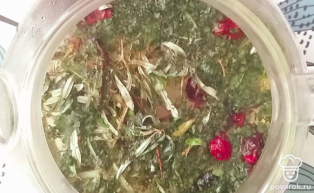 Все подготовленные ингредиенты переложите в заварочный чайник и залейте кипятком. Накройте заварочный чайник чайной бабой или укутайте полотенцем. Дайте настояться 15-20 минут. Приятного чаепития!