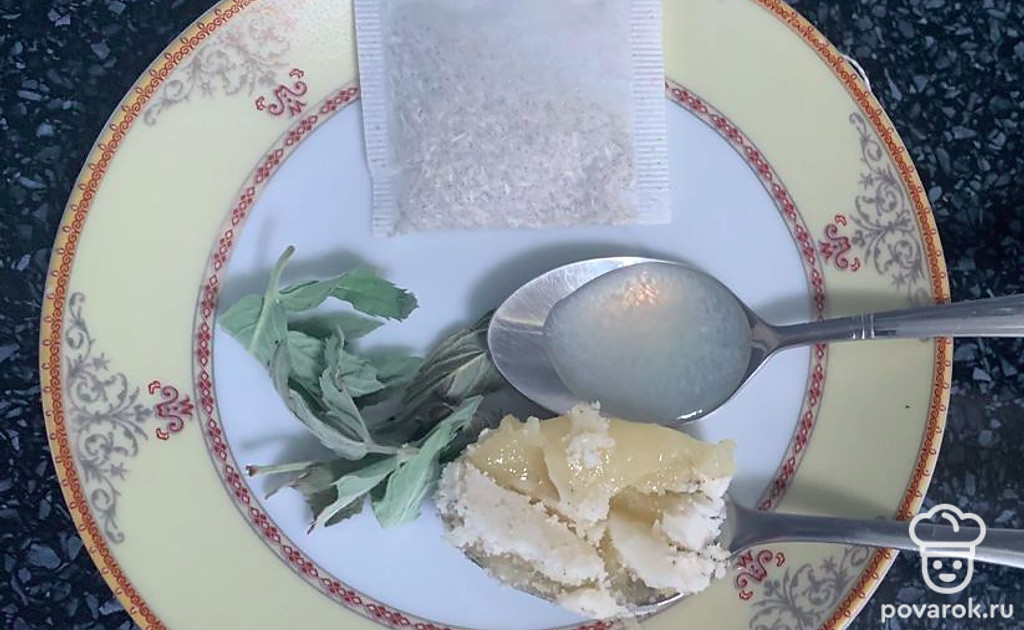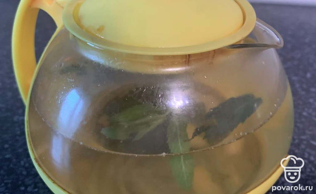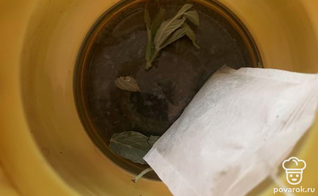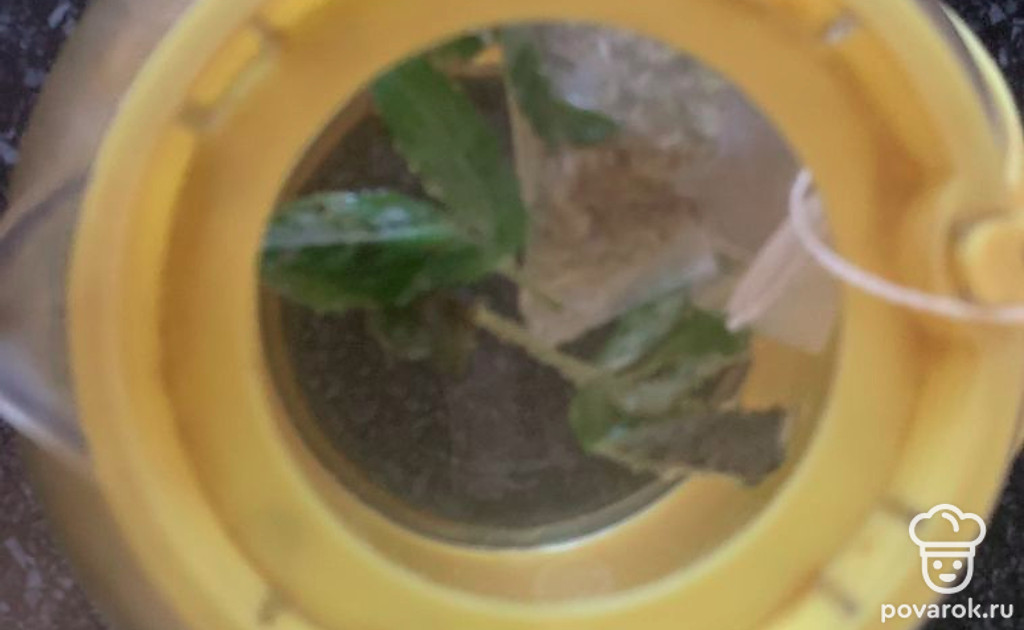 В заварочный чайник положить пакетик ромашкового чая, листья мяты и влить сок лимона.