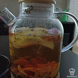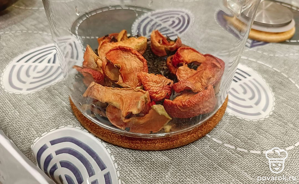 Добавляем горсть сухофруктов, в которых должны быть яблоки, груша, слива. Чем больше разнообразие фруктов, тем богаче аромат.