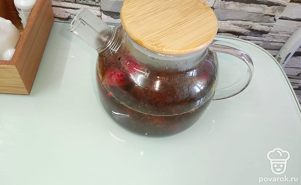 Залейте крутым кипятком, закройте крышкой. Настаивайте под закрытой крышкой 5-7 минут.