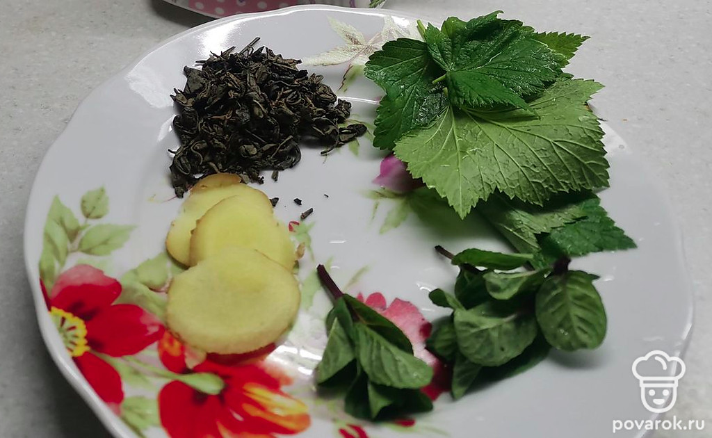 Заварочный чайник ошпарить кипятком. Взять сухой чай и наши ароматные травы. Имбирь порезать на тонкие ломтики.