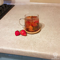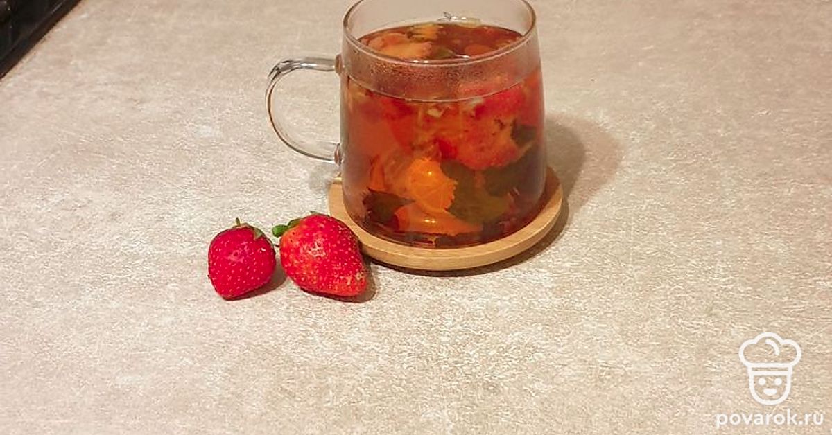 Яркий аромат клубники и согревающий вкус мяты. Очень вкусный чай.