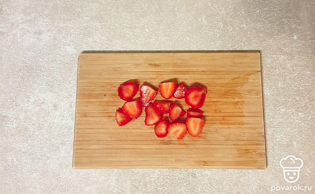 Клубнику и мяту выложите в тарелку и помните вилкой, чтобы клубника пустила сок.