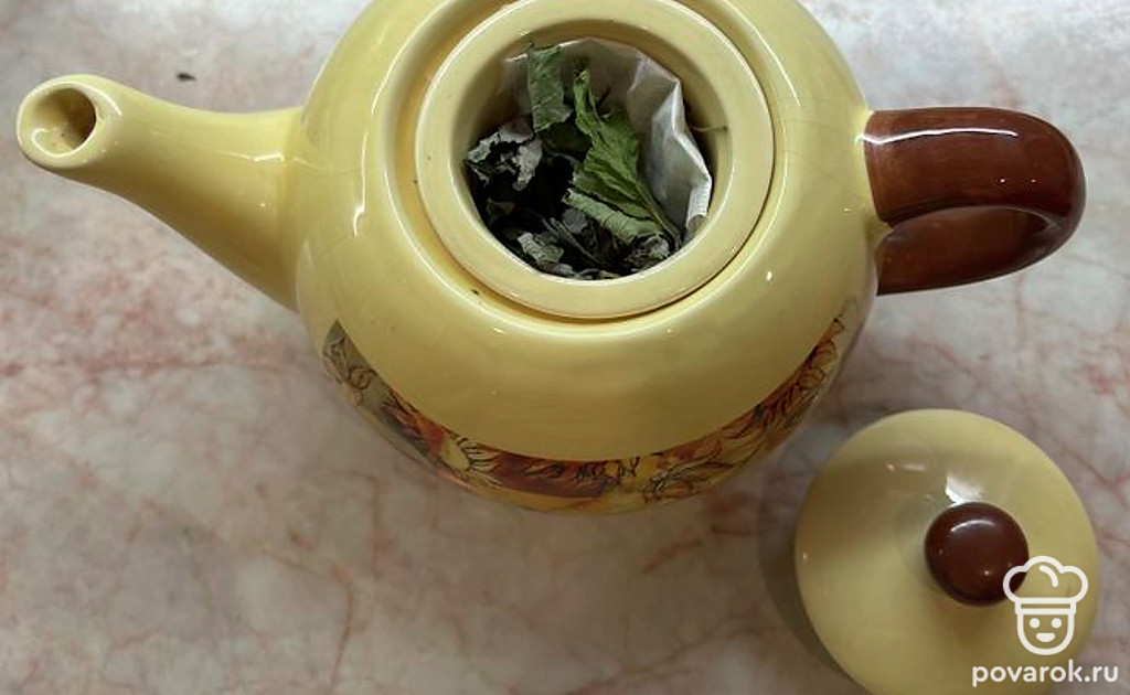 В заварочный чайник поместить листья смородины и мелиссы, пакетик ромашки.