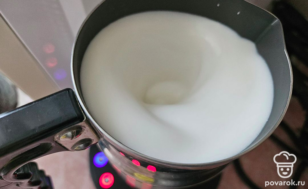 Взбейте молоко до крепкой однородной пены с помощью венчика или капучинатора.