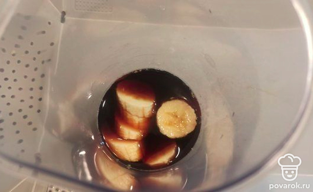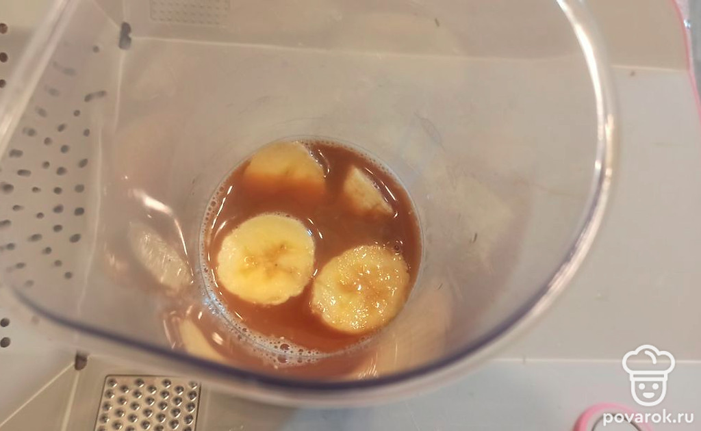 В чашу блендера выкладываем бананы и наливаем кофе.