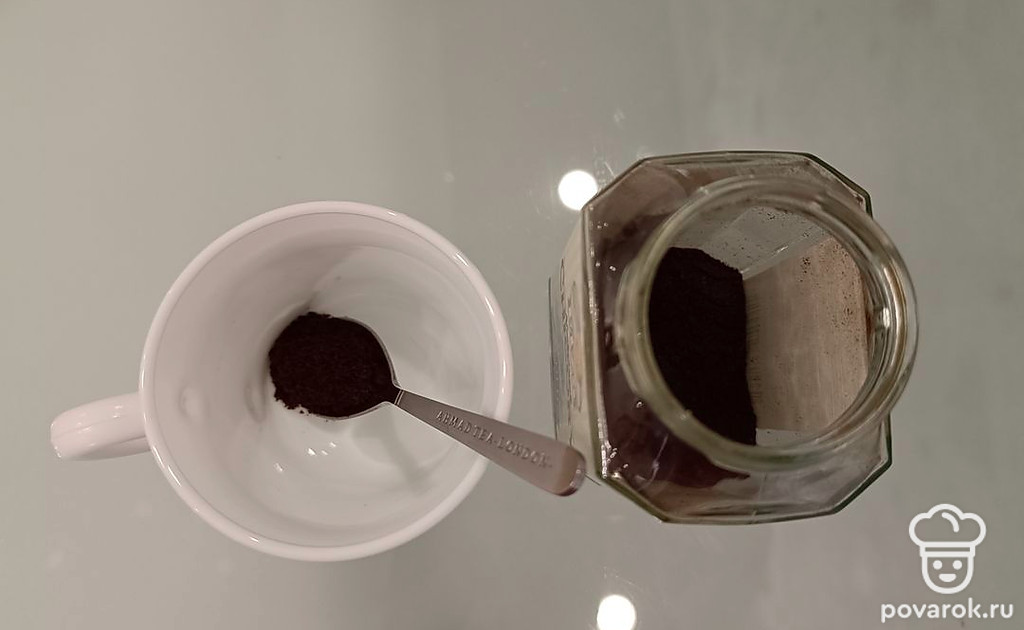 Зысыпьте в чашку 1 чайную ложку молотого кофе.