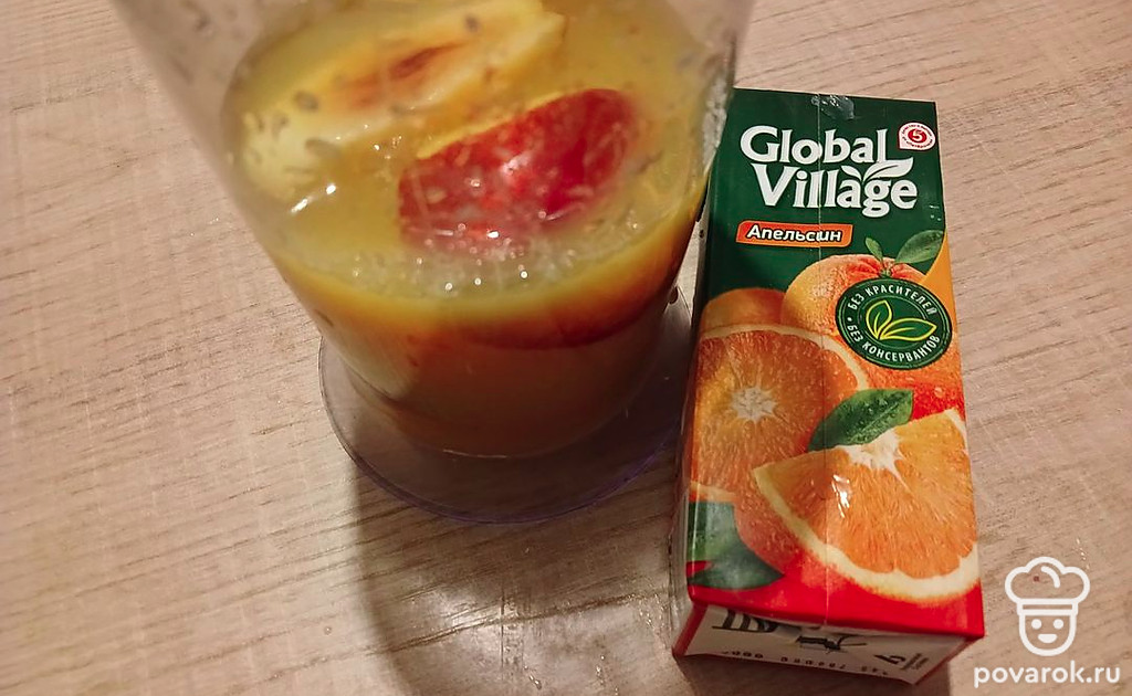 Переложите кусочки нектарина и моркови в блендер, добавьте апельсиновый сок.