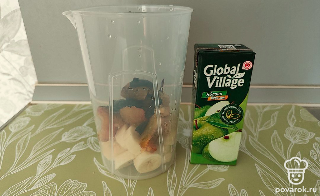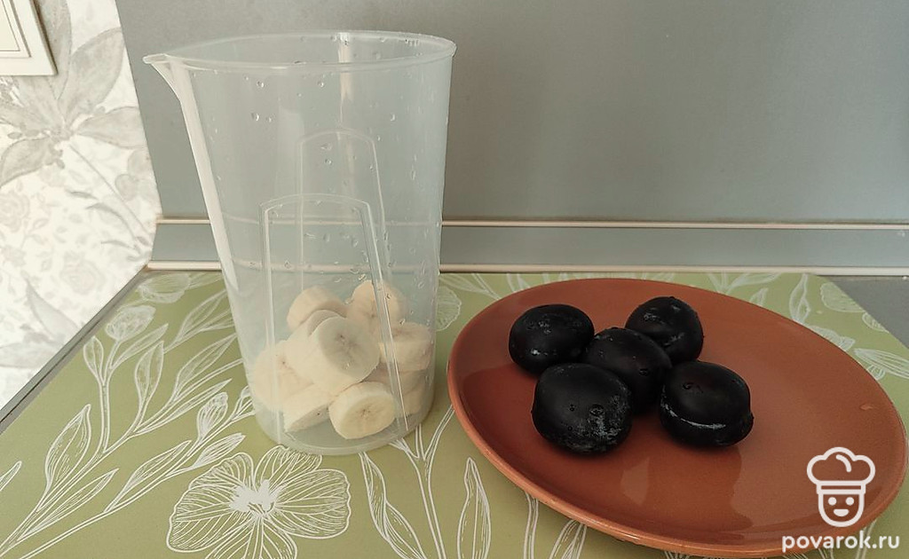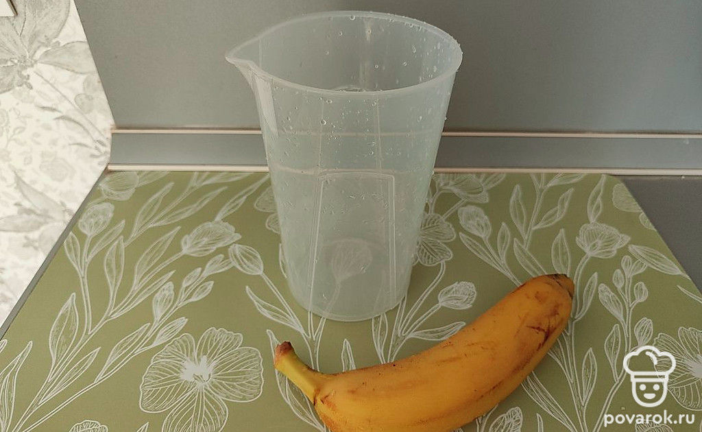 Банан очистите от кожуры и нарежьте. Отправьте в чашу блендера.