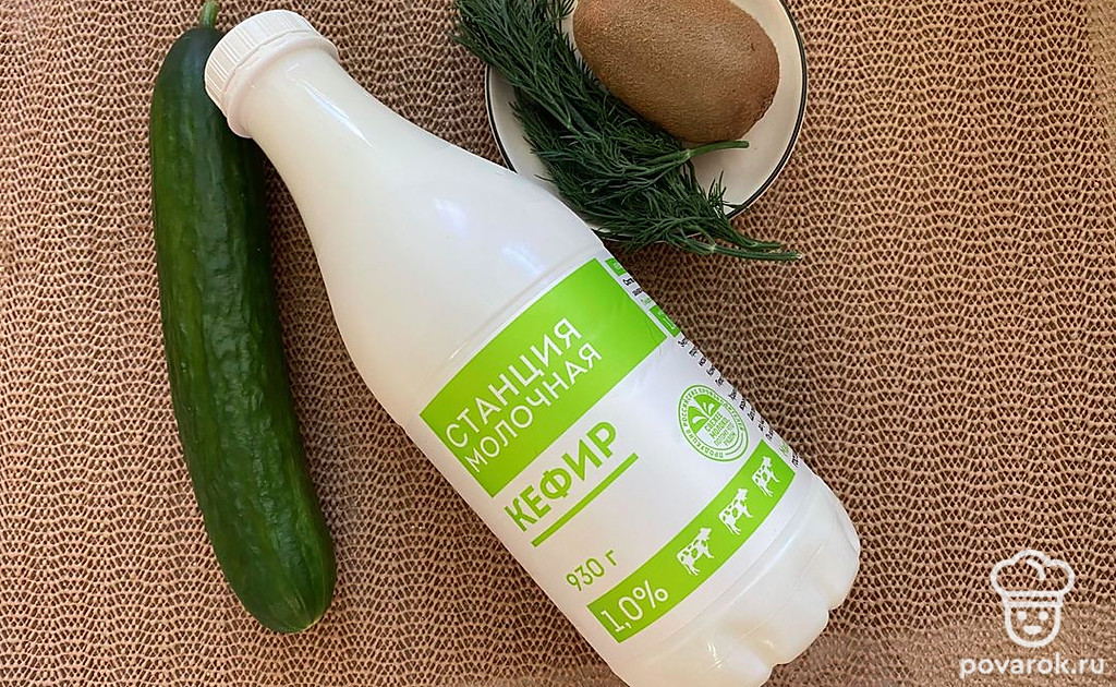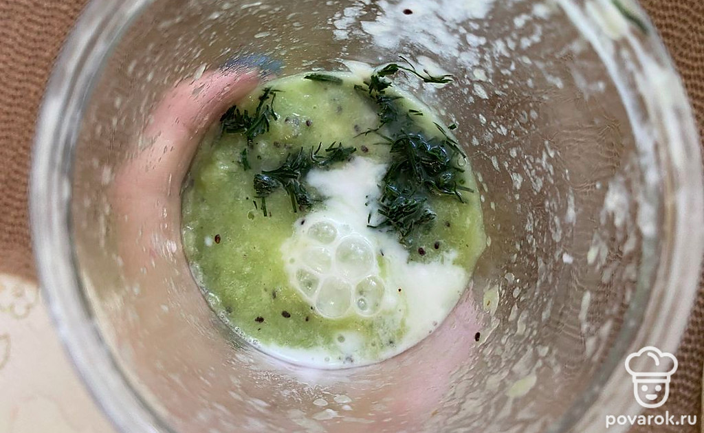 Добавьте измельченный укроп и кефир. Тщательно пробейте блендером.