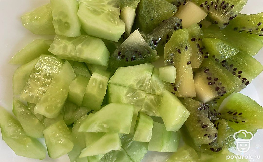 Огурец и киви помойте, почистите и нарежьте небольшими кусочками. Поместите в блендер и пробейте.