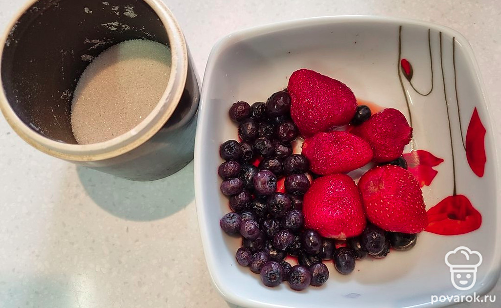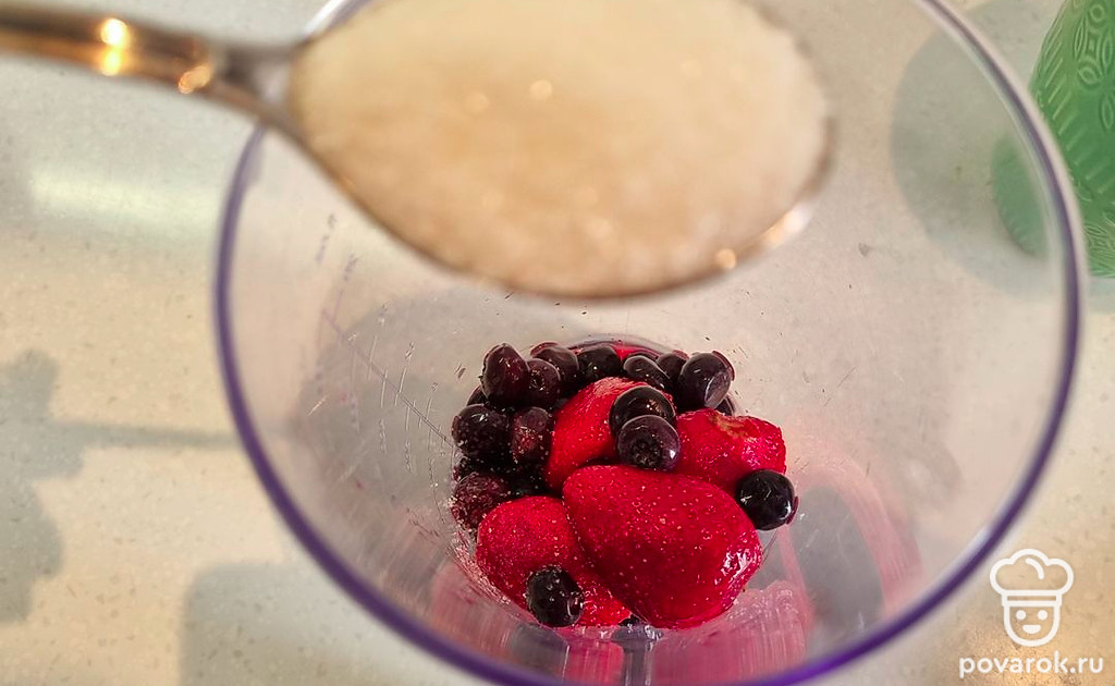 Высылаем в чашу блендера малину и чернику, затем добавляем сахар.