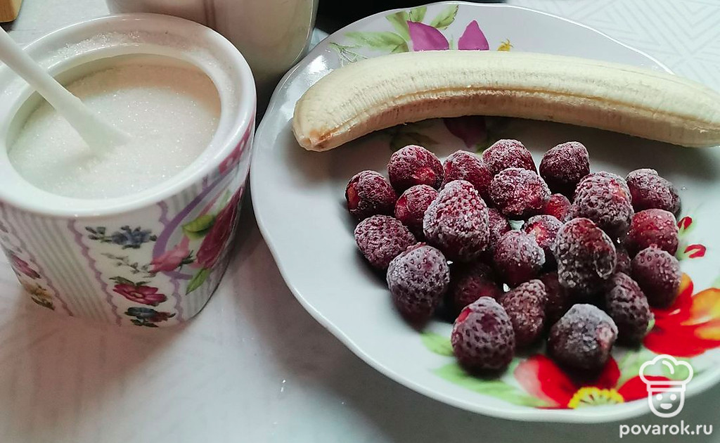 Подготовим все ингредиенты. Молоко должно быть хорошо охлаждено в холодильнике. Сейчас зима, поэтому клубника у меня замороженная. Это даже лучше! Так смузи станет еще более холодным, лучше взобьется и его будет еще приятней пить.