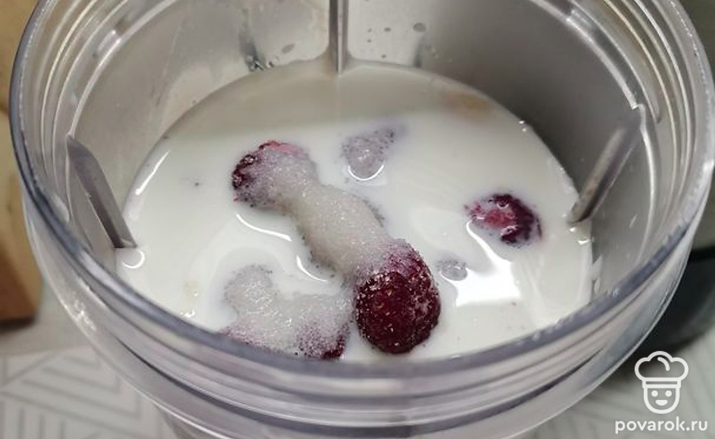Смузи лучше делать с помощью мощного блендера. В чашу блендера помещаем все ингредиенты: молоко, банан, клубнику и сахар. Сахара можете положить меньше или больше, на ваш вкус.