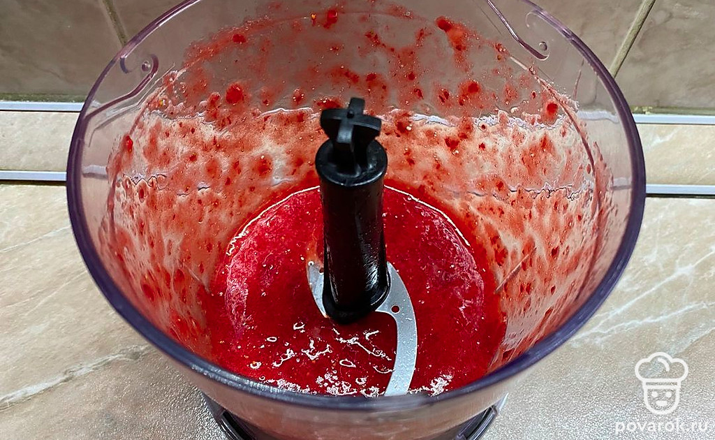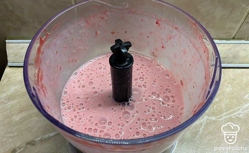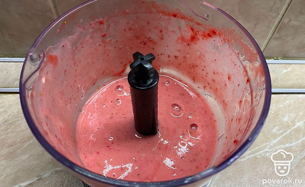 У ягод клубники оторвать хвостики, промыть их и измельчить в блендере.