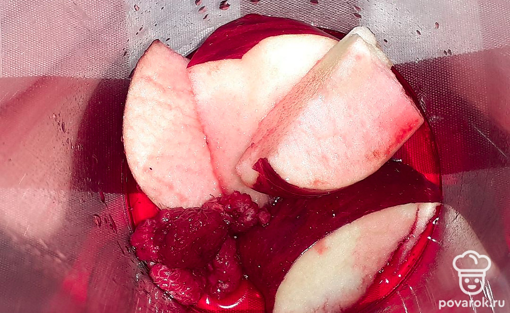 Помыть и порезать яблоко. В чашу блендера добавить яблоко, малину.