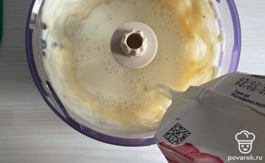 Добавить йогурт. Я использовала вкус персик-маракуйя, но можно взять любой йогурт, с добавками или классический.