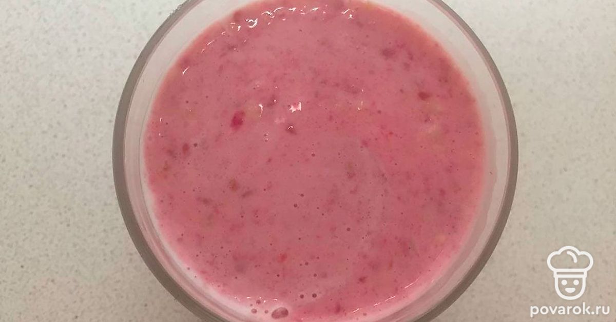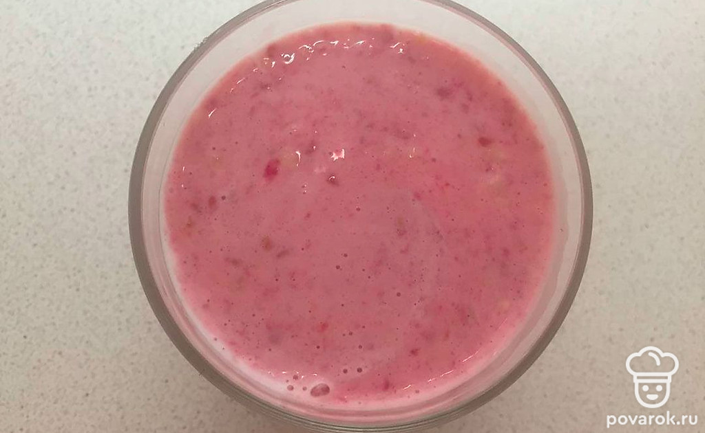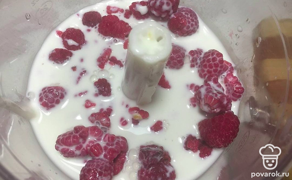 Залейте в блендер молоко с йогуртом и добавьте малину, оставьте несколько ягодок для украшения. Молоко, йогурт и малину хорошо измельчите в течение 45 секунд.