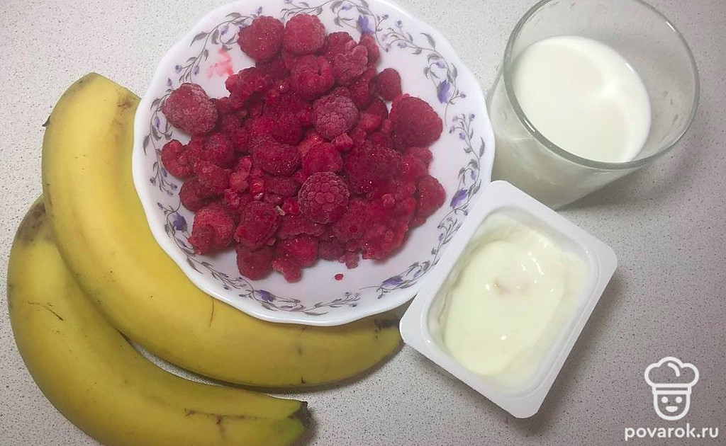 Приготовьте блендер, достаньте из холодильника йогурт и молоко, помойте малину, помойте и очистьте бананы от кожуры.