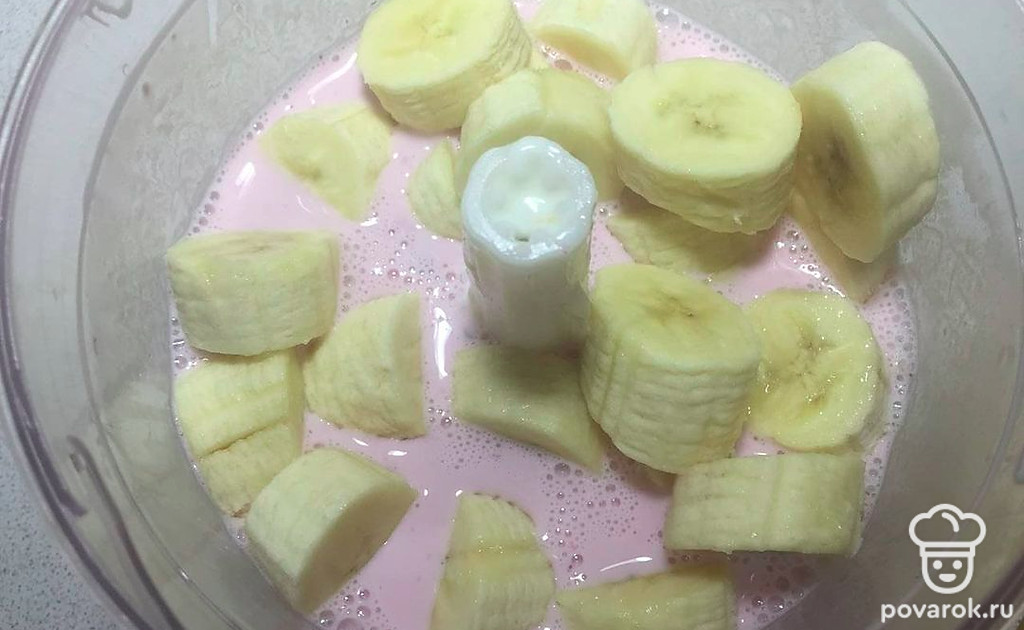 Возьмите очищенные бананы, нарежьте на кусочки среднего размера и добавьте их к полученной ранее массе в блендере. Хорошо измельчите все ингредиенты в течение 1 минуты до однородной массы, состояния фруктового пюре, и разлейте аккуратно по двум стаканам.
