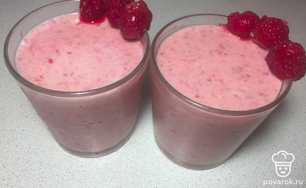 Готовые стаканы со смузи украсьте ягодками малины или листиками мяты. Перед употреблением можно слегка охладить напиток в холодильнике.