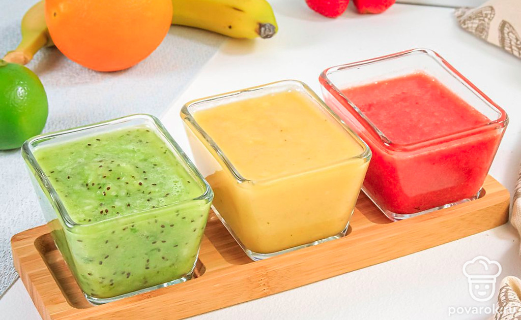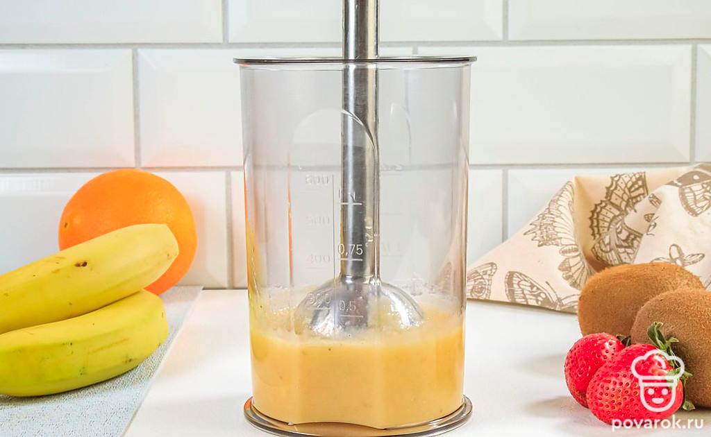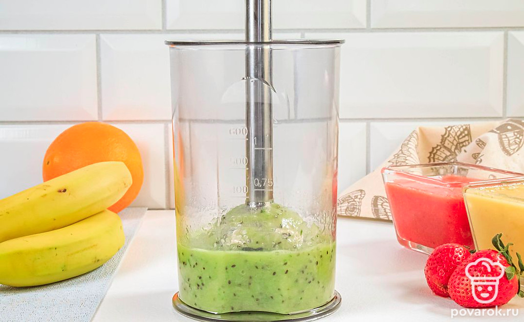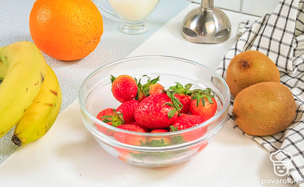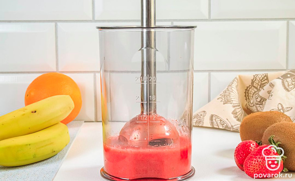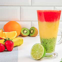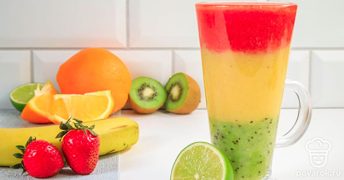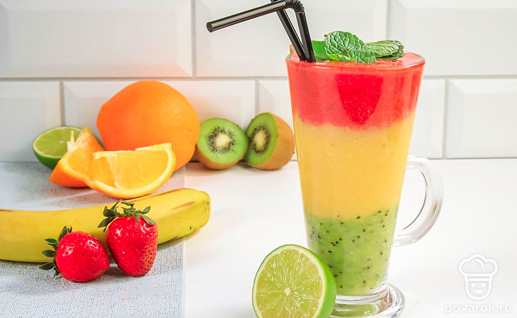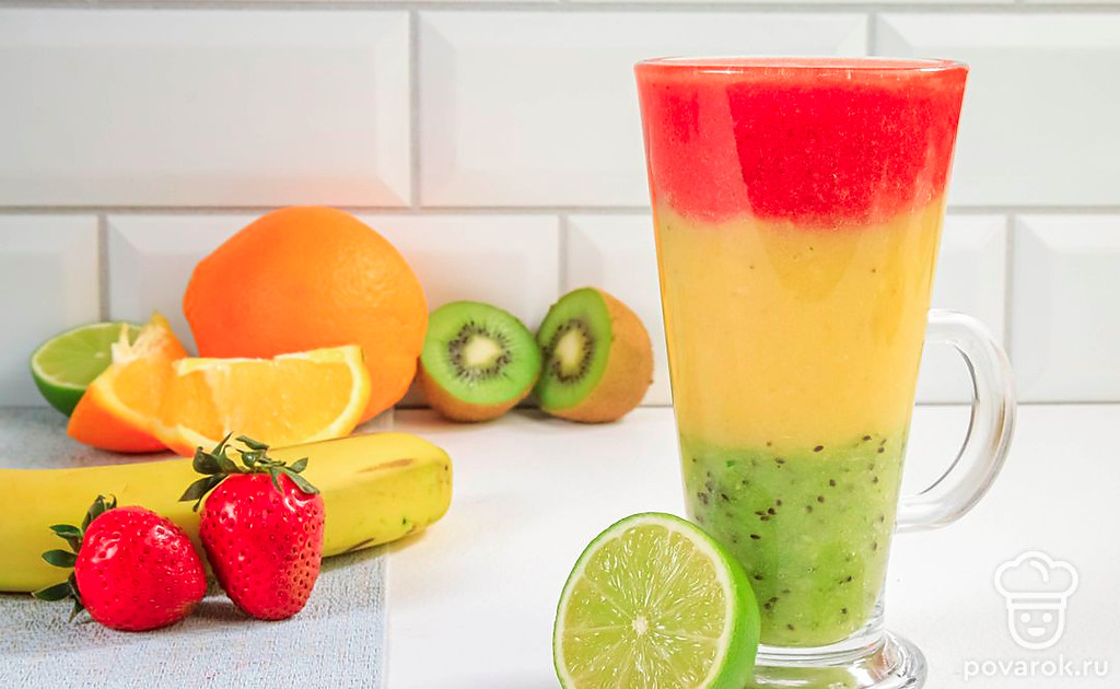 Приверженцам здорового питания, а также вегетарианцам придется по душе яркий и сочный смузи из клубники, бананов, апельсина и киви. В этом фруктовом напитке сохраняются польза и вкус фруктов. Вдобавок такой смузи выглядит очень нарядно, ведь все ингредиенты выкладываются слоями по принципу светофора, за что напиток и получил свое название. Вы можете подбирать другие подходящие по цвету фрукты. Например, возьмите вместо клубники арбуз, а вместо банана и апельсина — дыню.