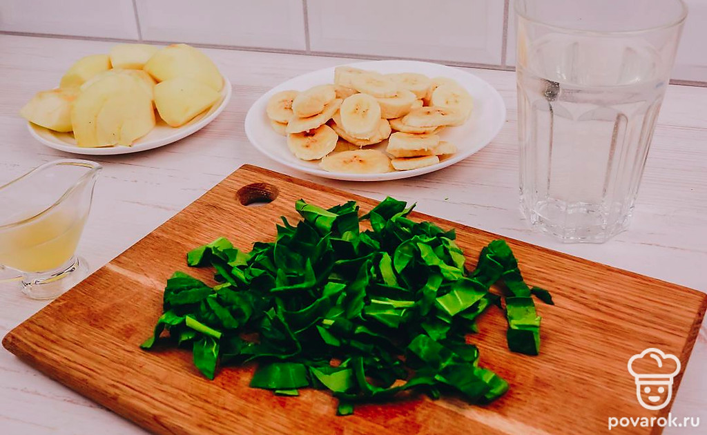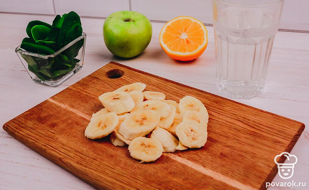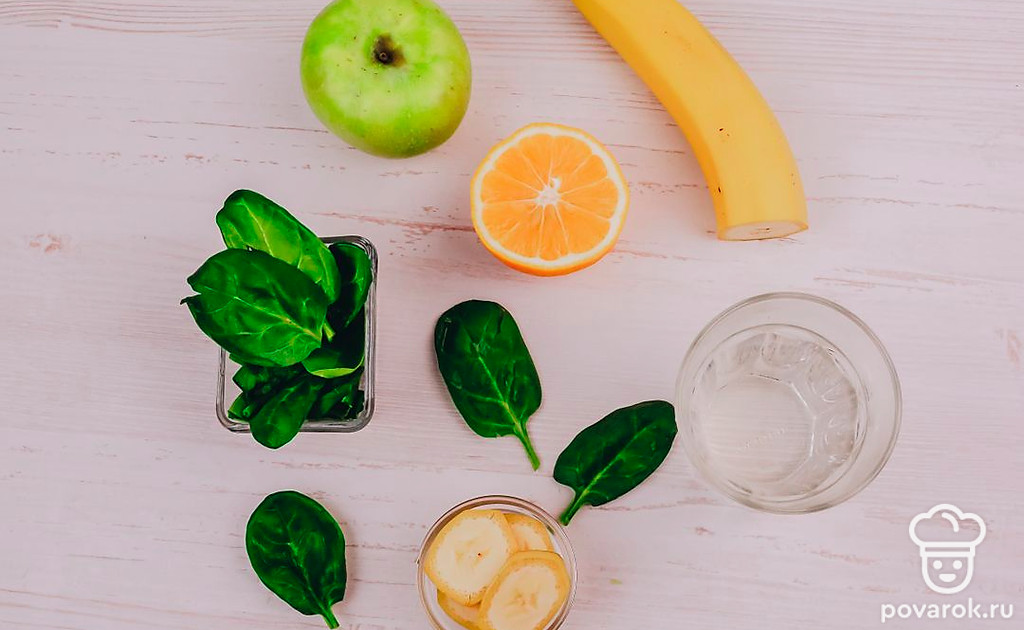 Проверьте все необходимые ингредиенты, помойте фрукты и шпинат, подготовьте рабочую поверхность.