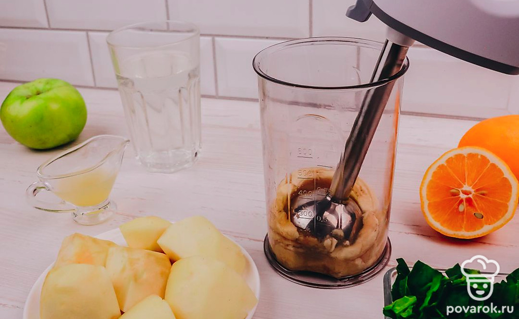 Добавьте в чашу блендера шпинат и апельсиновый сок, взбейте блендером. Если смузи получился слишком густым добавьте теплую кипяченую воду и взбейте блендером до однородности.