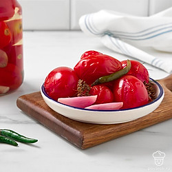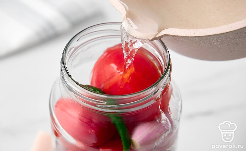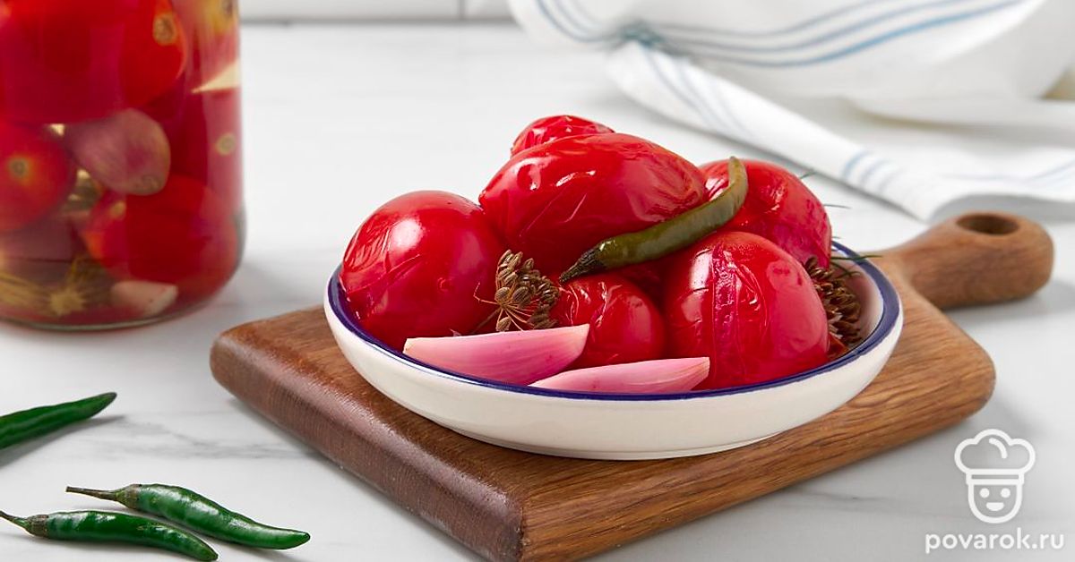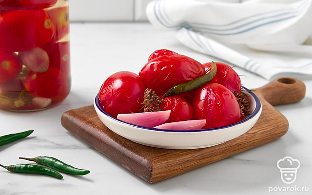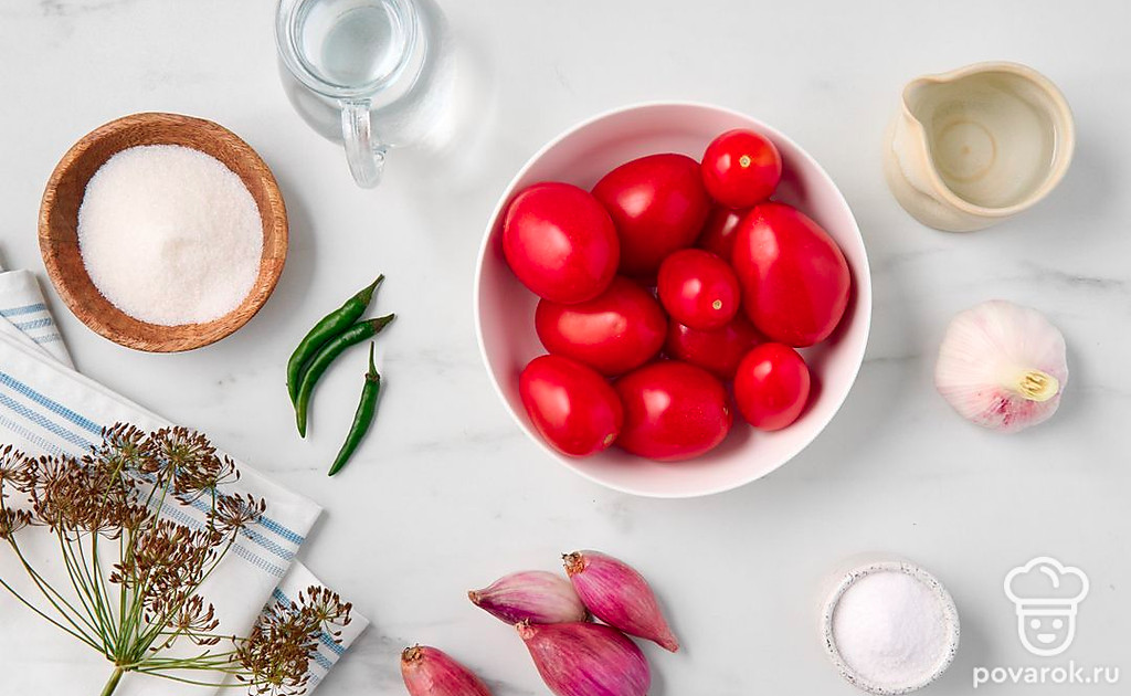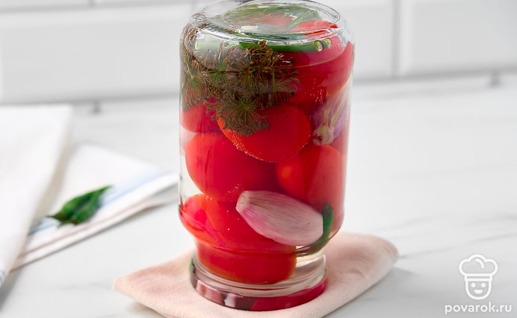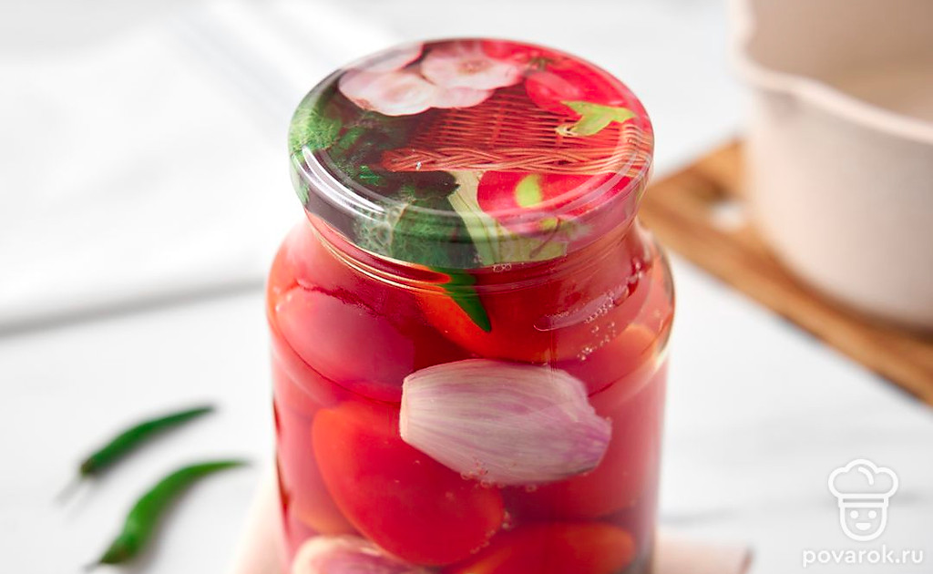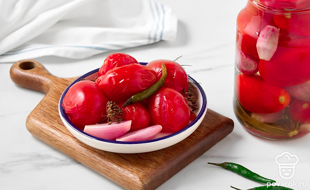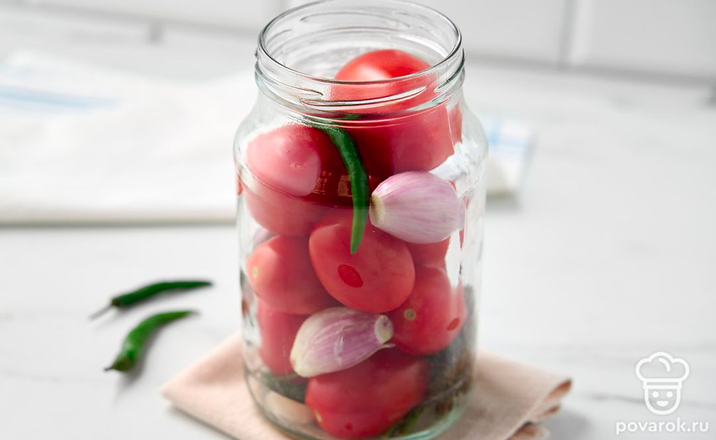 Маринованный лук придаст сладким помидорам освежающе-пикантный привкус с легкой горчинкой. Заготовка дополнит блюда из картофеля и мяса, заменит свежий лук и помидоры в зимних салатах. Выберите спелые, но крепкие помидоры небольшого размера, например, сливовидные или крупные томаты черри. Вместо лука-шалот подойдут маленькие луковицы обычного репчатого лука или жемчужный лук.
