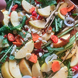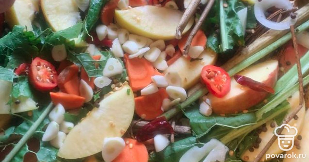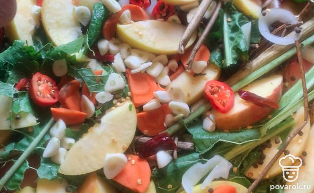 Слоями и сверху положить чеснок, перец, морковь, лук, яблоко, зелень и горчичный порошок. Смеси дайте настояться несколько месяцев.