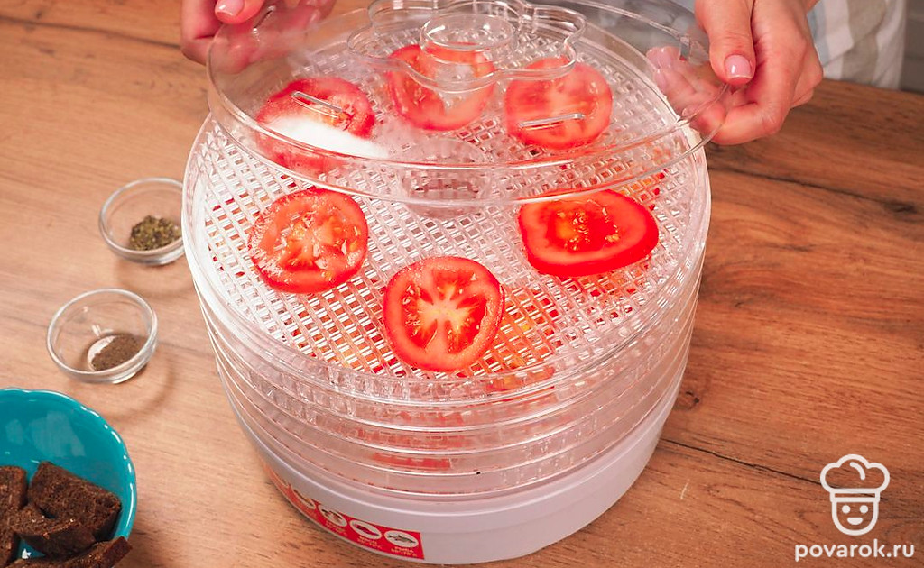 Отличие вяленых помидоров в сушилке от тех, что готовятся в духовке, состоит в том, что в электросушилке не нужно контролировать процесс готовки. Хоть он и займет немного больше времени. Готовое блюдо можно закатать в банки, сделав запасы на зиму. Для закуски можно использовать любимые специи и травы, а также добавить чеснок для аромата. Выберите качественное оливковое масло — его можно приобрести в любом продуктовом магазине.
