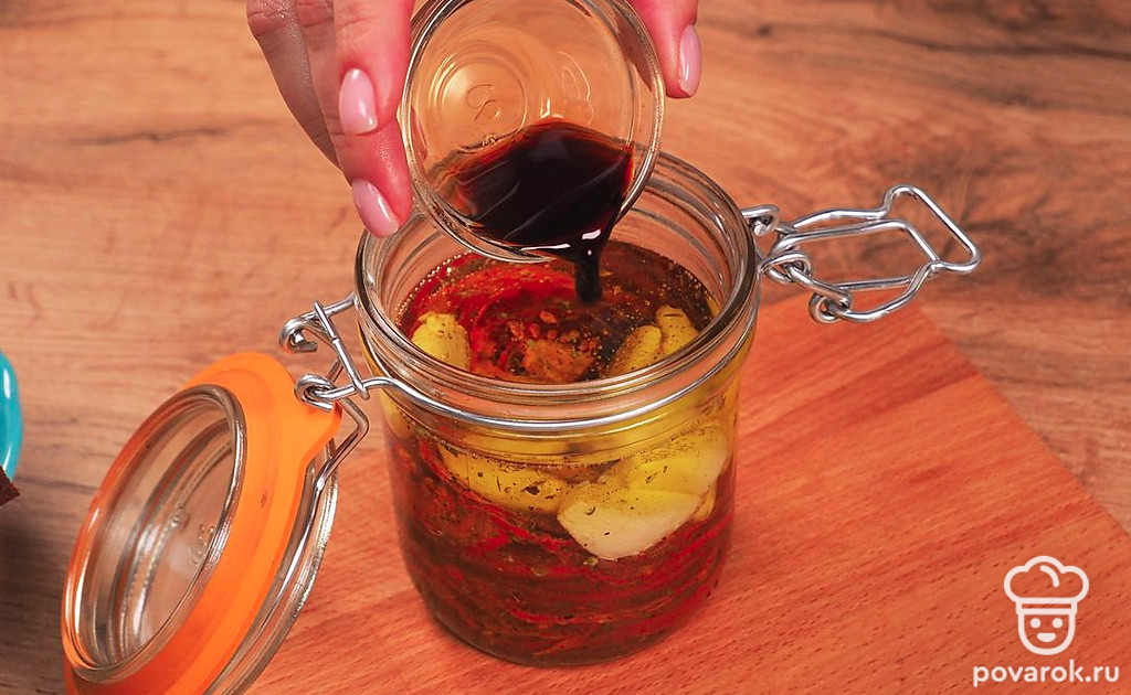 Закатайте помидоры в банки. Помидоры переложите в банки, посыпав итальянскими травами и перцем. В сотейнике нагрейте масло с зубчиками чеснока, не доводя до кипения. Чеснок достаньте из масла, положите поверх помидоров в банке. Залейте теплое масло в банку с помидорами. Добавьте бальзамический уксус. Закрутите крышку и уберите банку в холодильник.