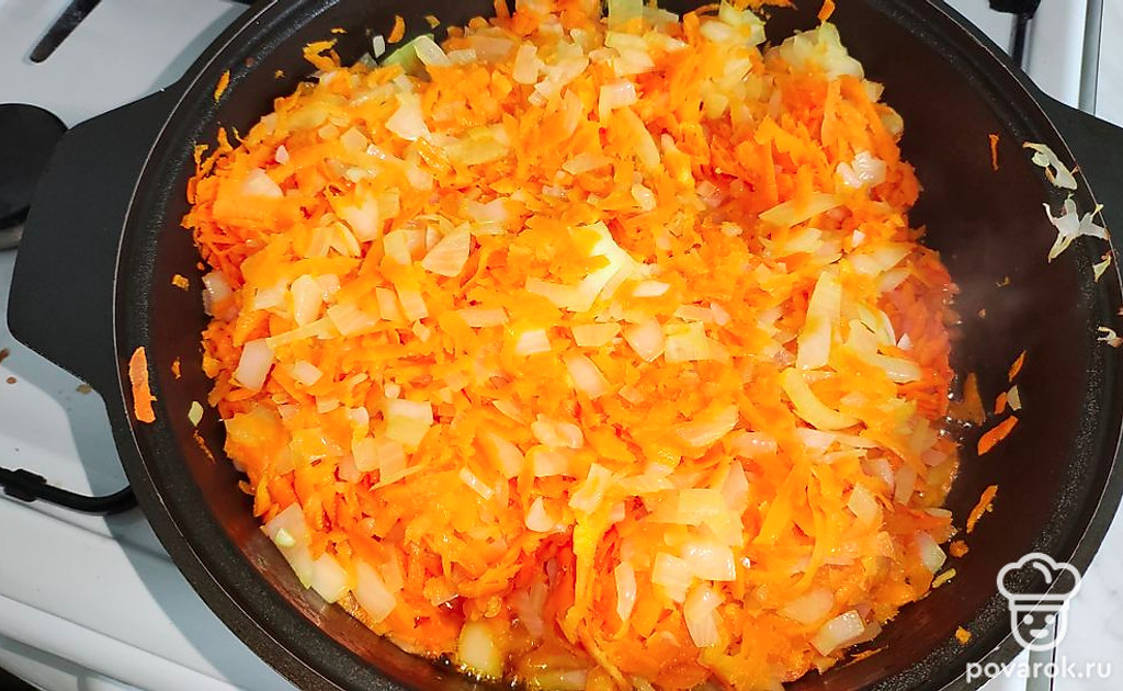 Лук нарежьте мелким кубиком. Морковь натрите на крупной терке. Обжарьте на растительном масле до мягкости овощей, посолите по вкусу.