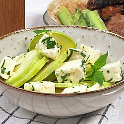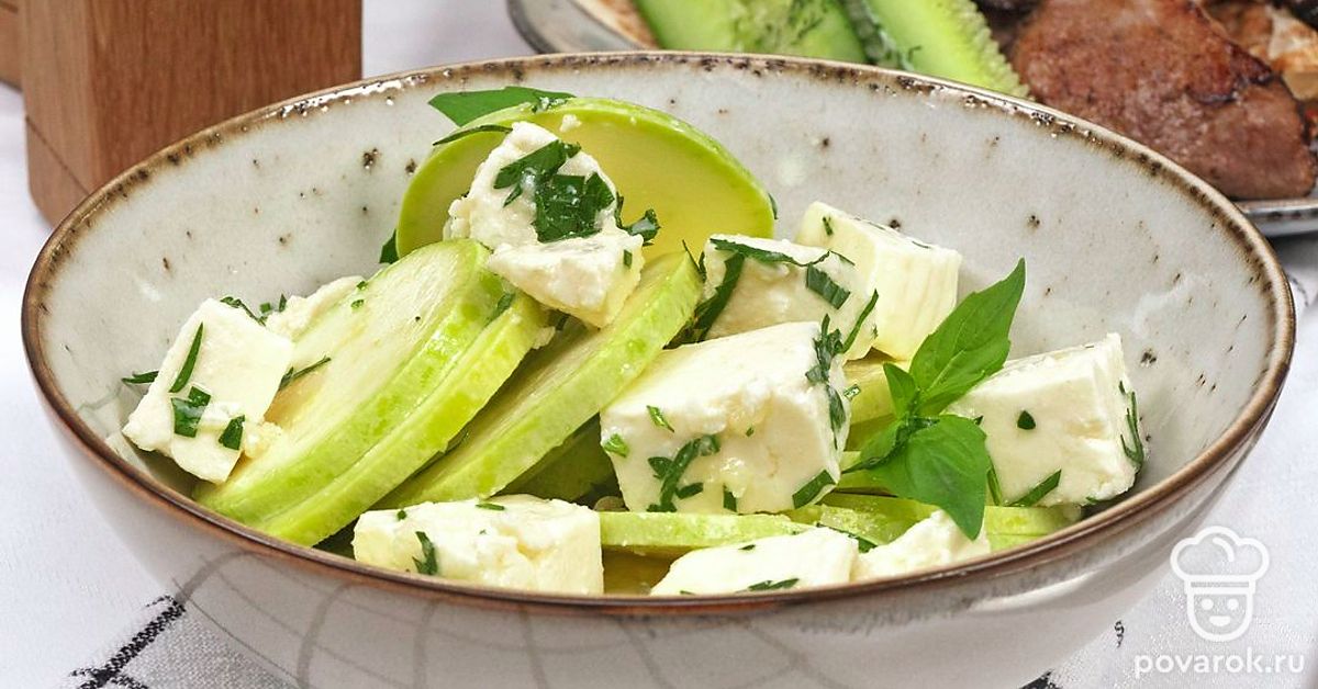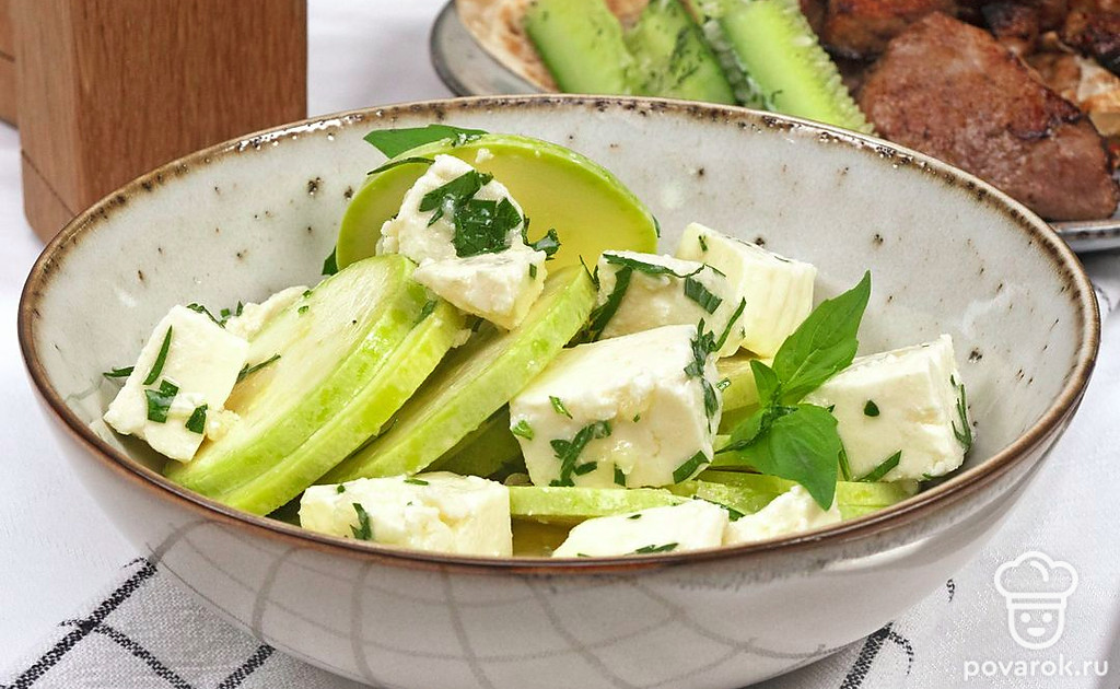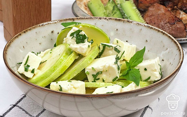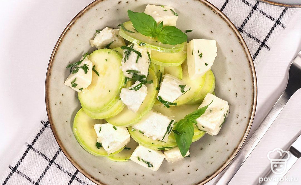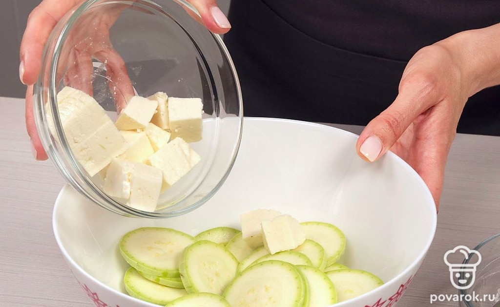 Подготовьте кабачки. Кабачок нарежьте тонкими кружочками. Адыгейский сыр нарежьте крупными кубиками. Смешайте в отдельной посуде кабачок и сыр.