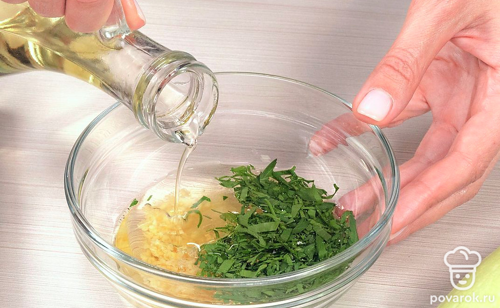 Подготовьте маринад. Зелень петрушки мелко измельчите. В отдельной миске смешайте яблочный уксус, соль, измельченную петрушку, чеснок и масло.