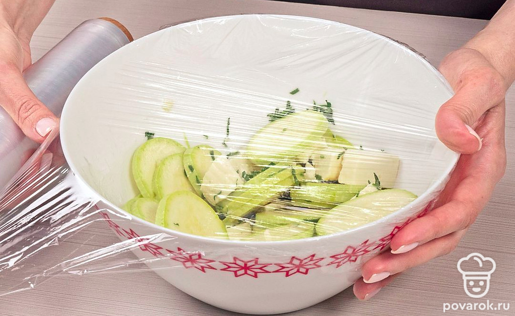 Замаринуйте кабачки. Залейте кабачок с сыром маринадом. Хорошо перемешайте. Закройте крышкой или пищевой пленкой. Уберите в холодильник на 2 часа.