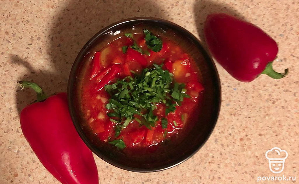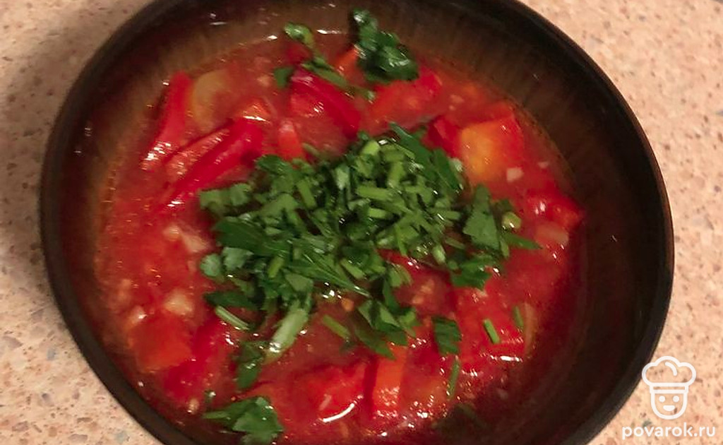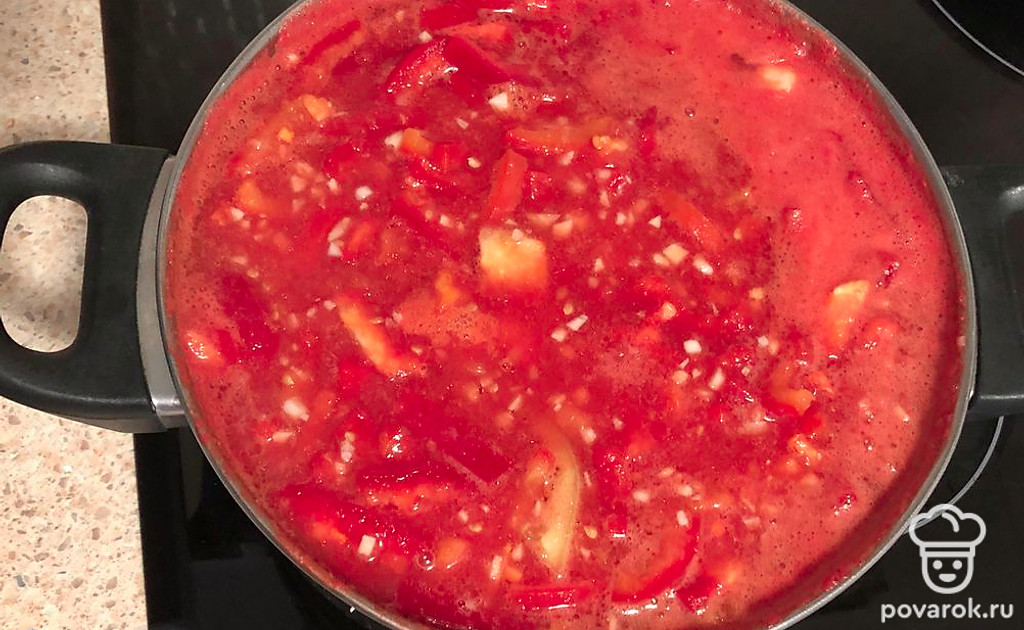 В кипящие томаты выкладываем болгарский перец, чеснок, растительное масло и варим 15-20 минут. За 5 минут до готовности добавляем уксус, молотый перец.