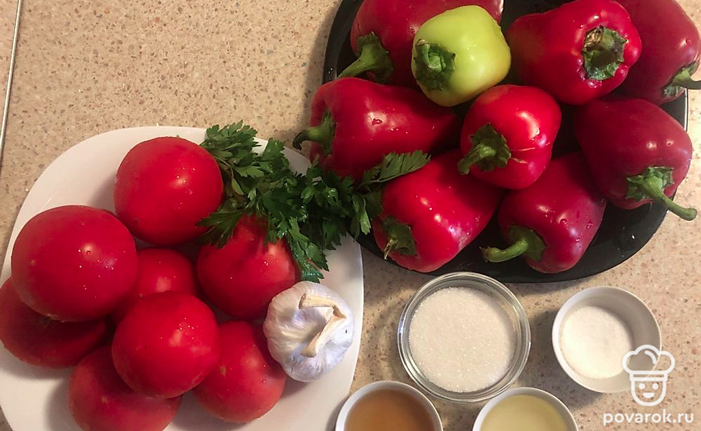 Подготавливаем ингредиенты: болгарский перец, помидоры, чеснок, зелень. Понадобится сахар, растительное масло, яблочный уксус, соль, черный молотый перец.