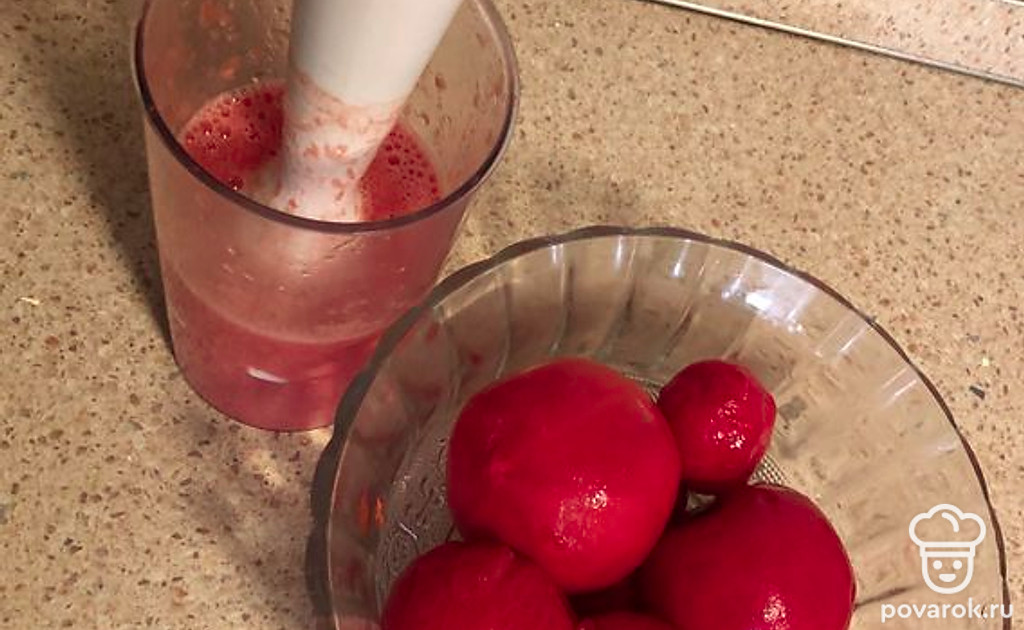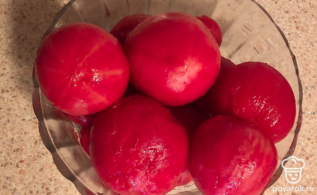 Бланшируем помидоры, то есть снимаем кожицу с помидоров. Для этого помидоры окунаем в кипяток, держим непродолжительное время. После чего кожица с помидоров легко и просто снимается.