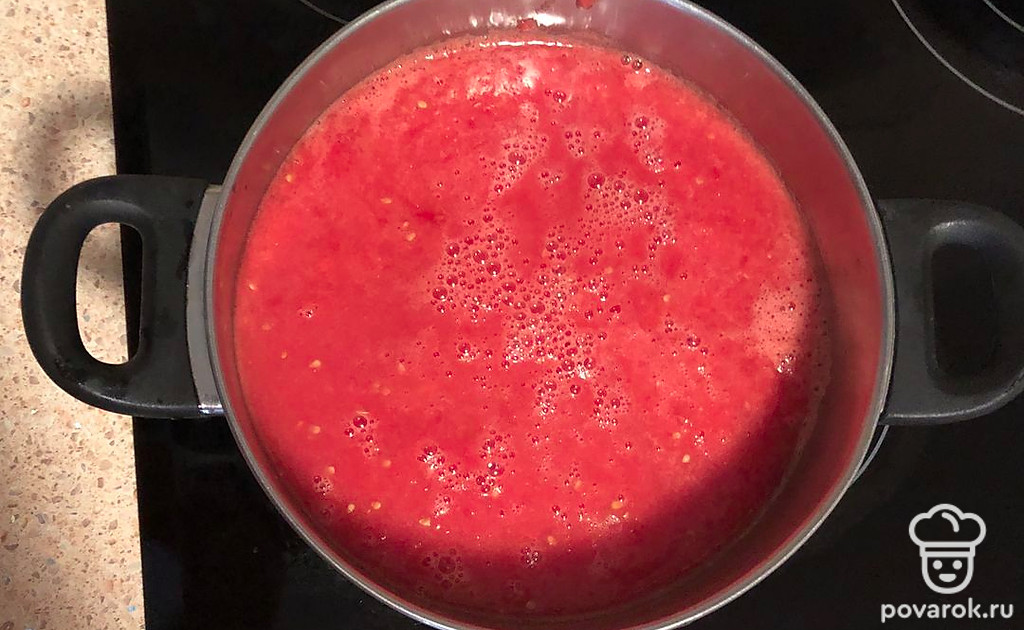 Полученный томатный сок доводим до кипения, добавляем сахар и соль.