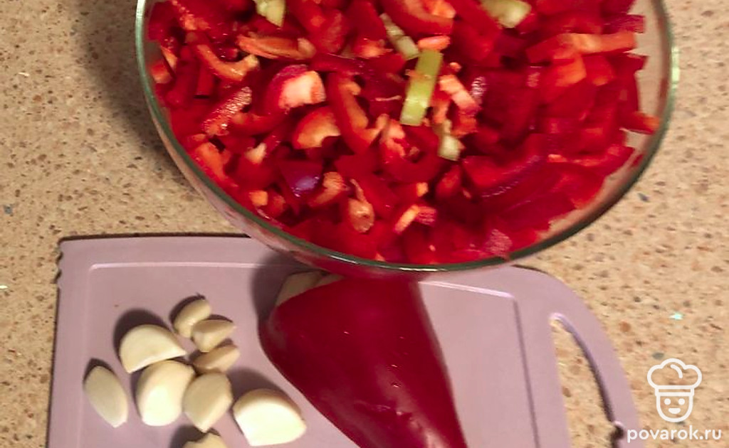 Пока готовятся томаты, режем болгарский перец небольшими брусочками. Измельчаем чеснок.