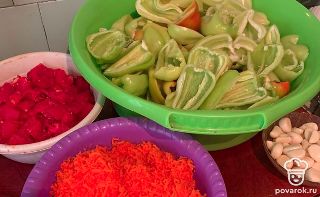 Режем сладкий перчик как вам удобно. Также очищаем чеснок и лук. Лук я пропустила через мясорубку, это на большие объемы. Все овощи выкладываем в разные емкости.