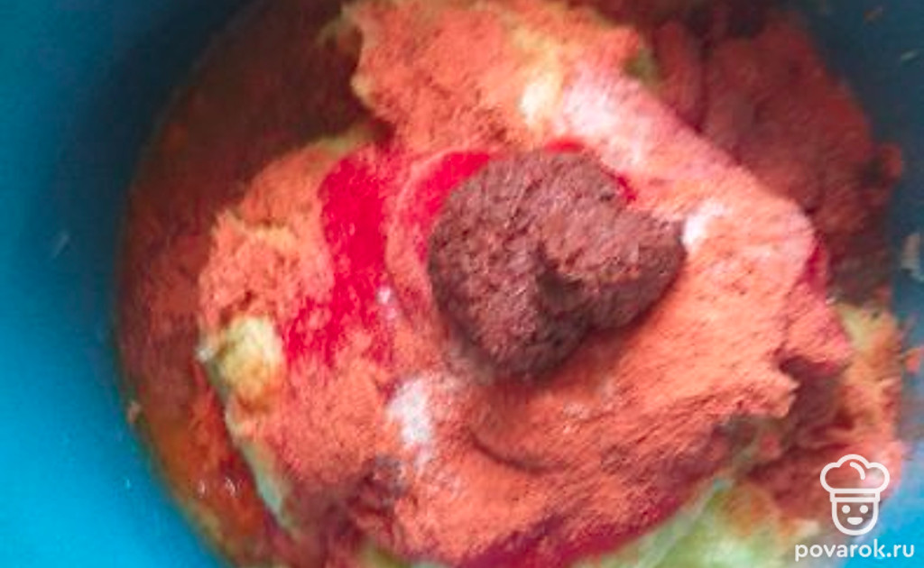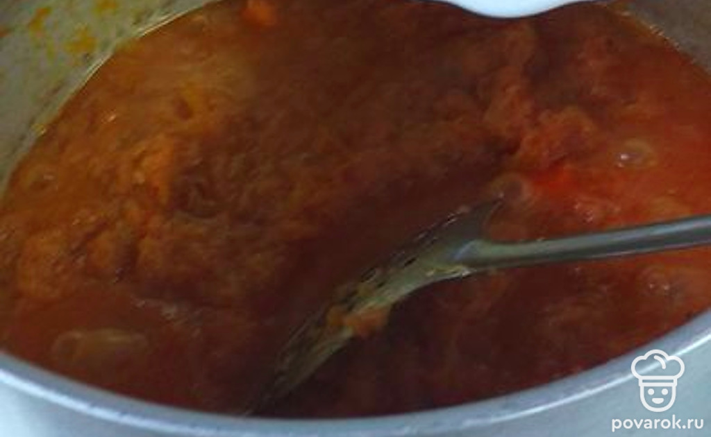 Перемешиваем и добавляем перец, томат и аджику, соль.