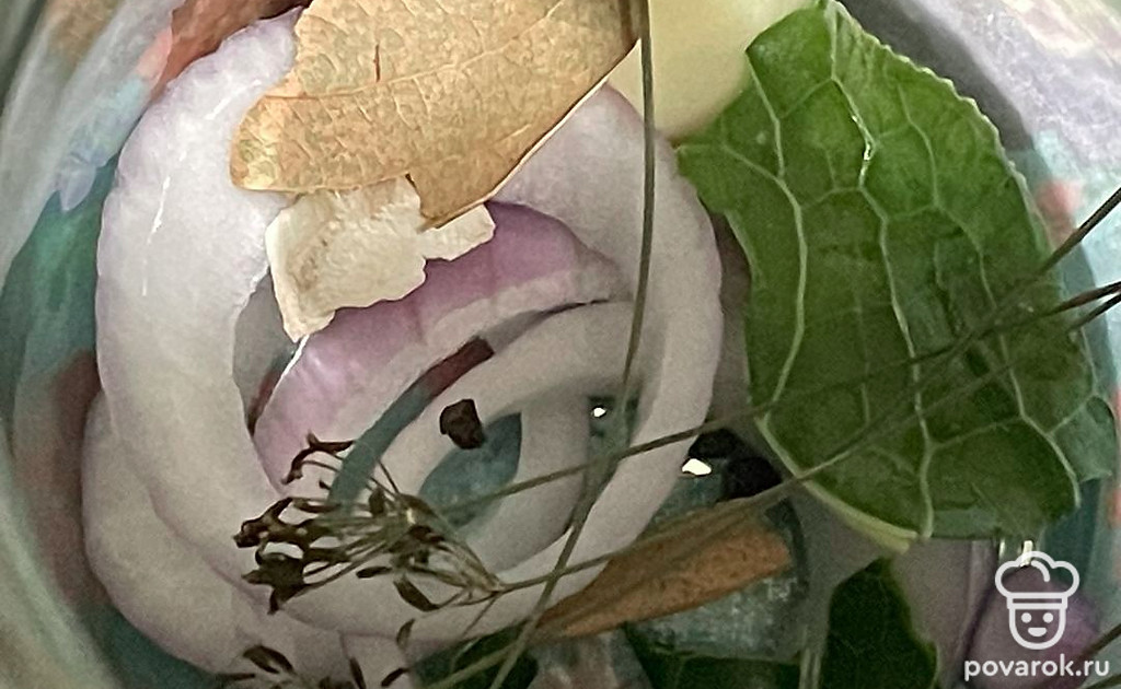 Банки предварительно простерилизуйте. На дно банки положите кольца лука, черный перец, хрен, чеснок и лавровый лист.