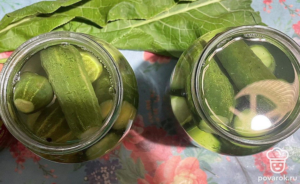 Плотно наполните банки огурцами. Залейте кипятком огурцы. Прикройте банки крышками и оставьте минут на 15. Потом слейте воду и повторите процедуру еще раз.