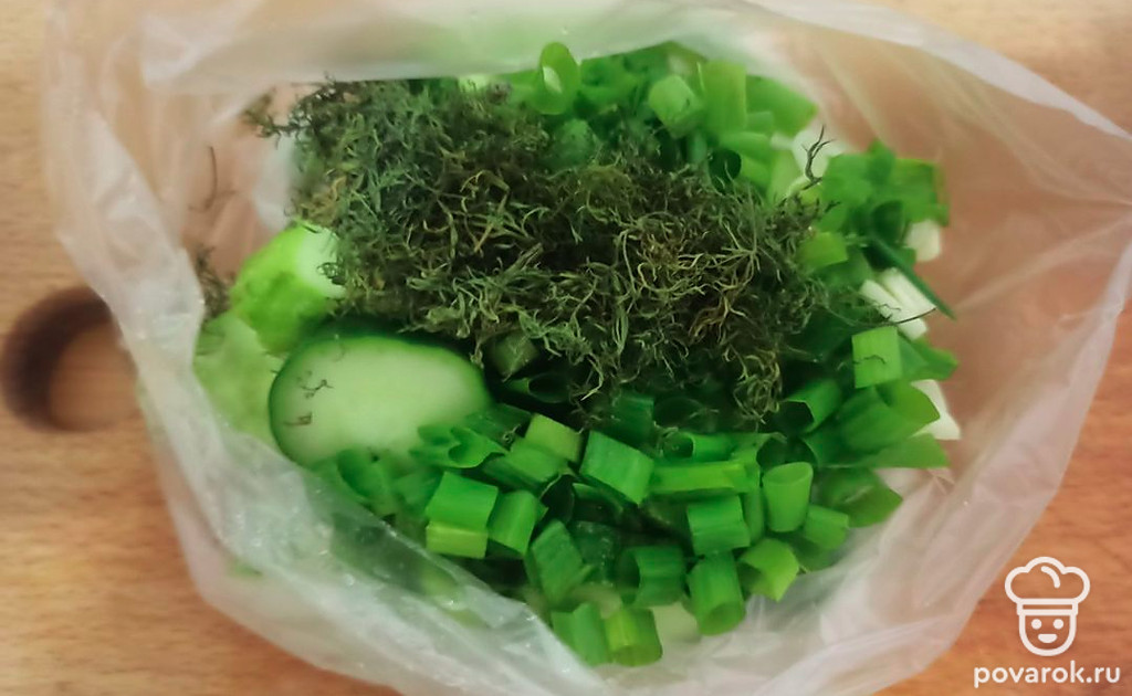 Выложите огурцы в целлофановый пакет. Добавьте чеснок и зеленый лук, сушеный укроп.