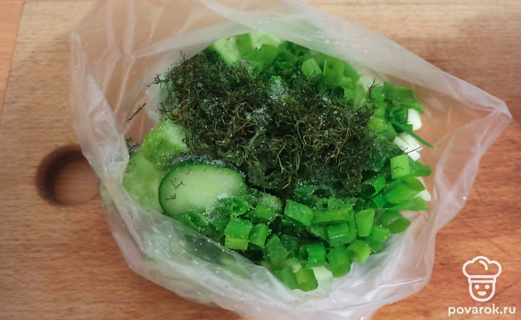 Положите соль. Завяжите пакет и хорошо помните его руками. Дайте постоять 5 минут. Блюдо готово.