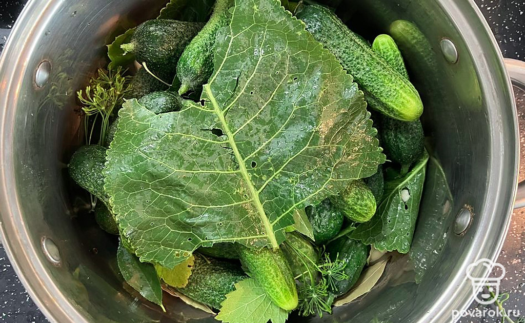 В кастрюлю выложить огурцы и листья черной смородины. Добавить черный перец и чеснок.